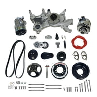 System includes chrome compressor and alternator, hardcoat black pulleys, black clutch and tensioner covers. - USA made, precision cast A356-T6 alloy, water pump housing with integrated compressor, alternator and power steering pump mounting points.
